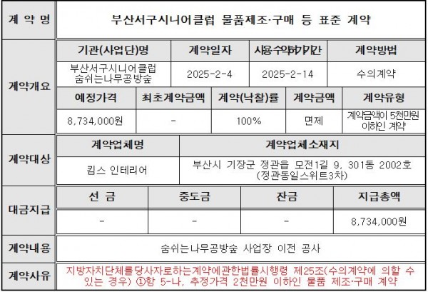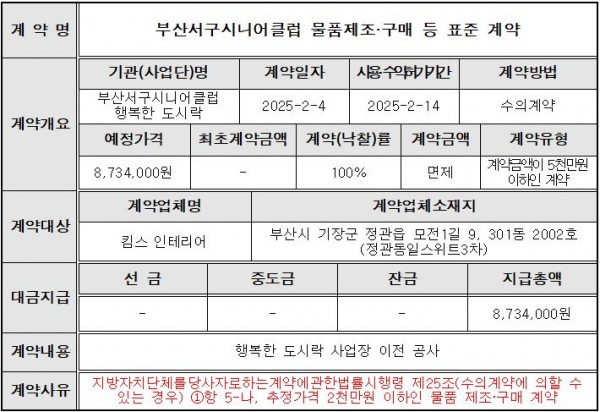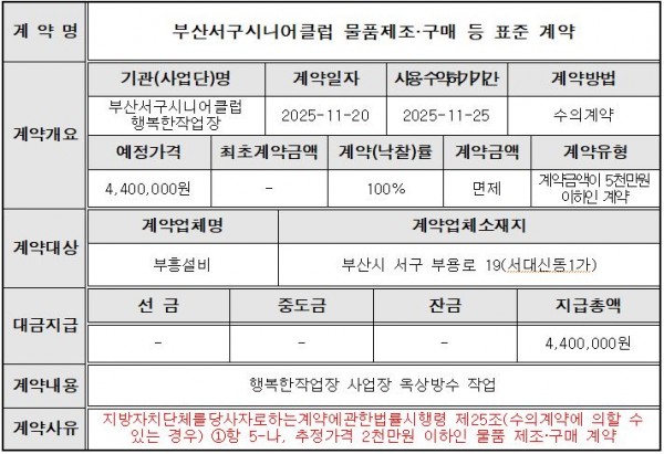 공지사항 HOME 커뮤니티 공지사항 공유하기 인쇄하기 부산서구시니어클럽 2025년 수의 계약 정보 공개 페이지 정보 작성자 부산서구시니어클럽 댓글 0건 조회 1,362회 작성일 26-01-07 19:13 본문 . 목록 이전글2026년 부산서구시니어클럽 정규직 신입 사회복지사 채용 공고 26.02.05 다음글부산서구시니어클럽 2026년 세입세출 예산서 공고 25.12.24 댓글목록 댓글목록 등록된 댓글이 없습니다.
